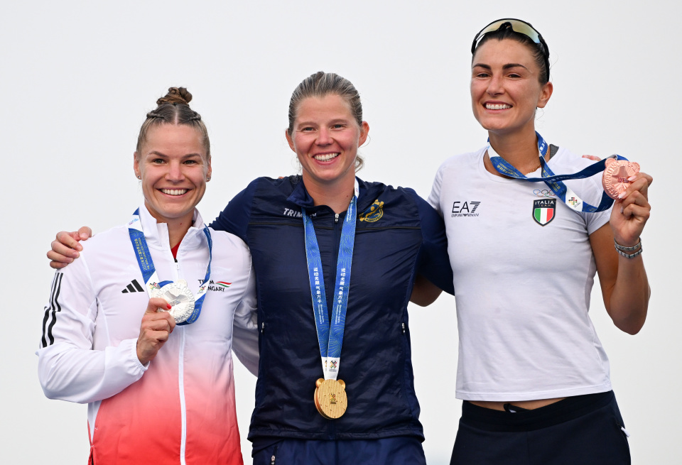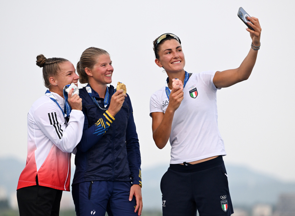 8月9日,冠军瑞典选手安德森(中)、亚军匈牙利选手万达(左)、季军意大利选手奇卡利在颁奖仪式上自拍。新华社记者 李嘉南 摄